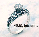 As a life long Tolkien fan, Paul Badali has envisioned the design for the Elven Rings of Power TM from The Lord of the Rings. That vision has finally been made manifest in precious metal. The Ring of Galadriel TM was designed using the leaves of the European Beech, a tree much loved by the Elves and Tolkien. Nenya TM is also called The Ring of Adamant TM, meaning The Ring of Diamond. Each ring is fit with a 1 ct. (5.25mm) Signity Star cubic zirconia, the highest brilliance CZ on the market. Optional alternate stones are available: 1/2 ct. Moissanite $370.00 US, 3/4 ct. Moissanite $520.00 US, 1ct. Moissanite $705.00 US; 1ct. Lab Grown Amethyst (purple), Emerald (green), Ruby (red), or Sapphire (blue) $10.00 US; or Moonstone, Opal, or Lab Grown White Star Sapphire cabochons $10.00 US. The platinum Nenya TM is available in US sizes 5 to 15, in whole and half sizes. Sizes 11.5 to 15 are an additional $20.00 US. The ring measures approximately 8 mm wide at the widest point and the band measures approximately 2.8 mm wide. Weight will vary with size. The detail of the leaf design can be accented with a black jeweler's antiquing treatment for $5.00. Please allow approximately two weeks for the production of this item, production time may be shorter. Includes Card of Authenticity. Officially Licensed from the books by J.R.R. Tolkien. Individually packaged in logo stamped ring boxes. Ring comes in the following metals: - Sterling Silver: $89.95